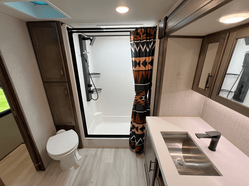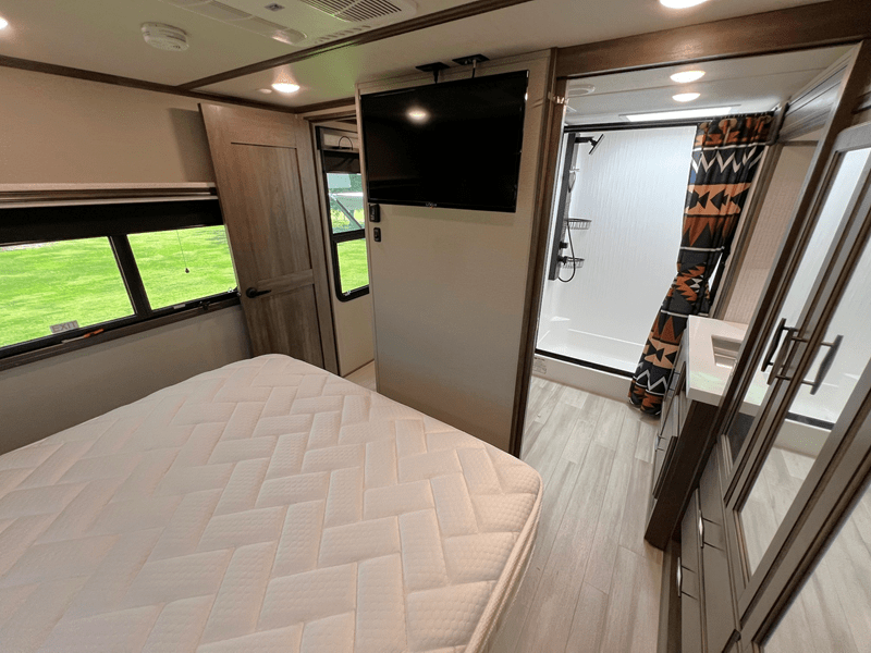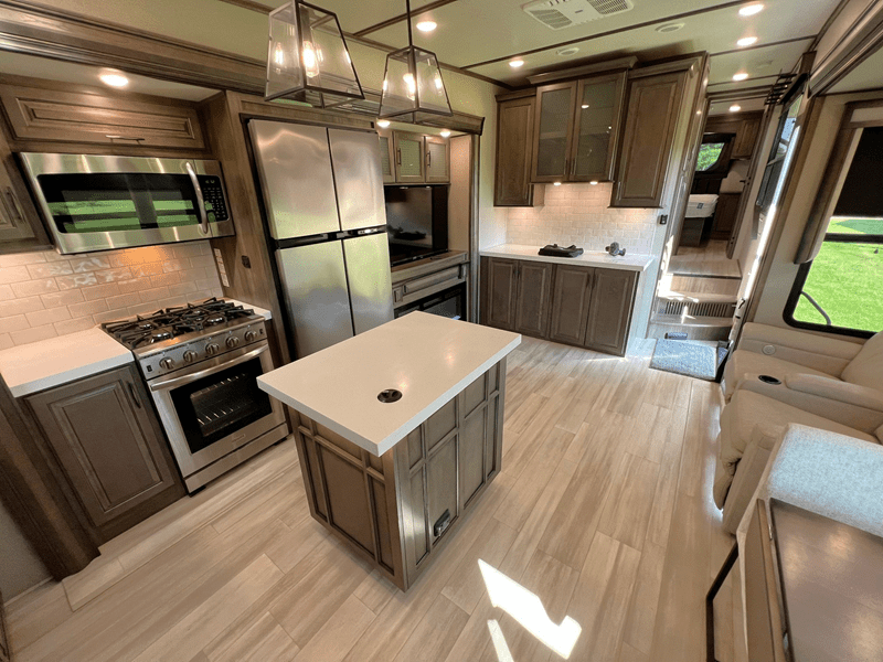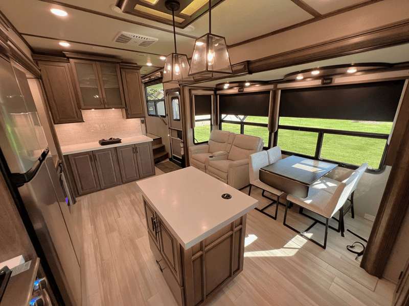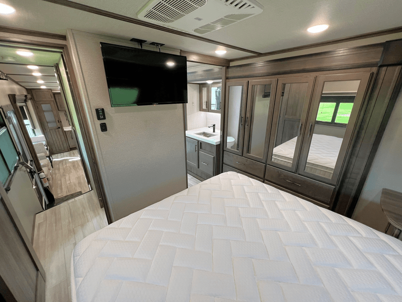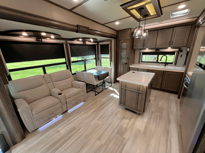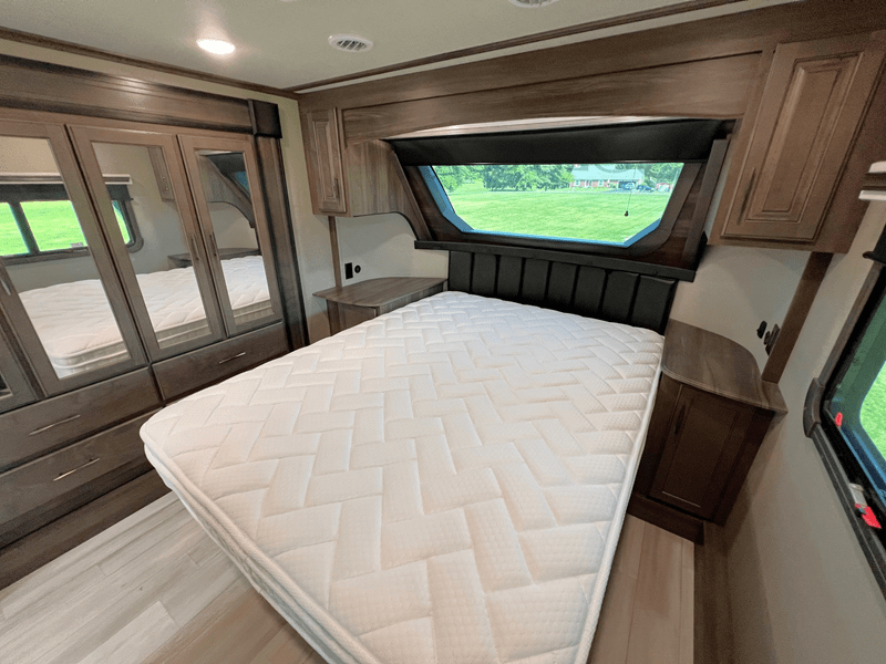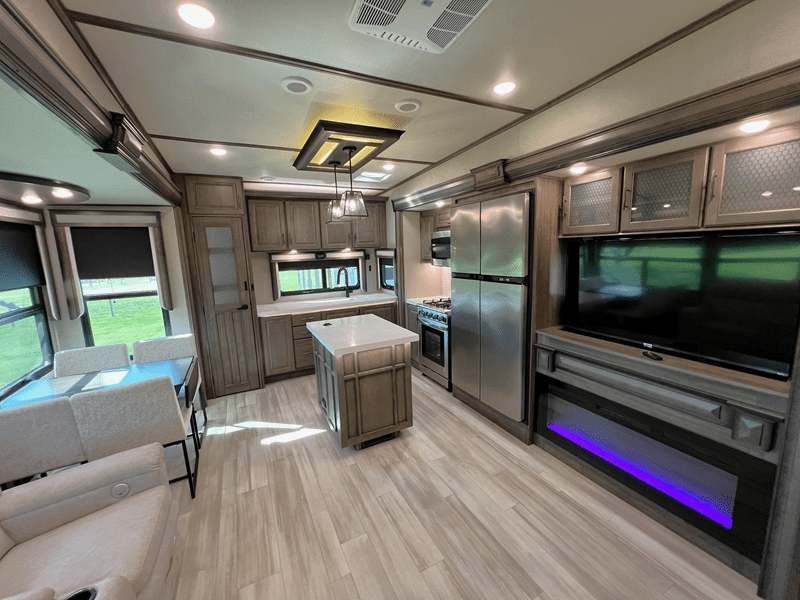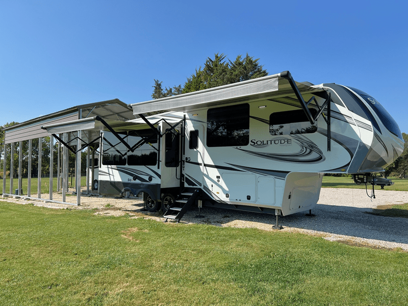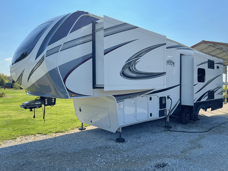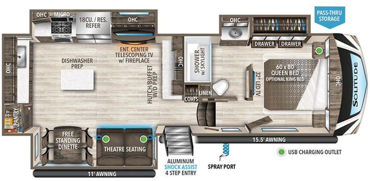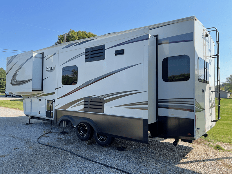 2022 Grand Design Solitude 280RK 5th wheel, 33 foot, (3) slide-outs, 6-point leveling jacks, 4-seasons insulation w/ enclosed heated underbelly, (2) large 15K BTU a/c units, high gloss fiberglass finish, aluminum frame construction, front molded fiberglass cap, Compass Connect remote control, tire monitoring system, backup camera system, new tires, 17.5" alloy wheels, spare tire, (2) power awnings, 50 amp service, outside shower, washer/dryer prep, dishwasher prep, central vac, home theater, Bluetooth, outside speakers, (2) tvs, solid surface counter tops, stainless steel appliances, microwave, oven, 12 gal. gas/electric water heater, large 18 cu. ft. gas/electric refrigerator, fireplace, reclining theater seats w/ heat & massage, new queen bed, sleeps 2, excellent condition.